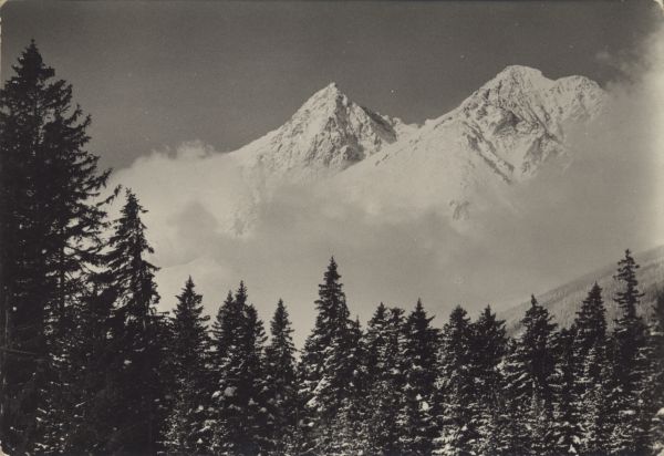 Widok na otoczone chmurami szczyty: Łomnicy, Kieżmarskiego i Małego Kieżmarskiego Szczytu w scenerii zimowej. Na pierwszym planie las.