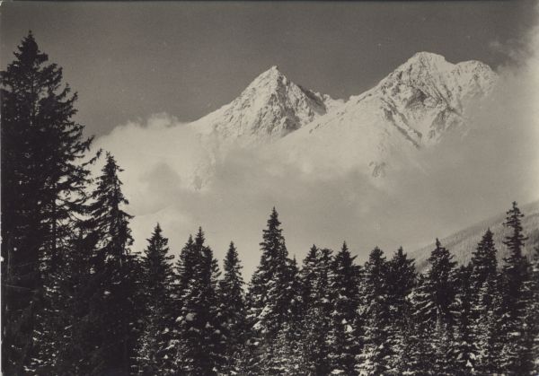 Widok na otoczone chmurami szczyty: Łomnicy, Kieżmarskiego i Małego Kieżmarskiego Szczytu w scenerii zimowej. Na pierwszym planie las.