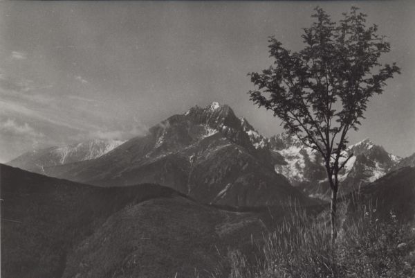 Widok na masyw Łomnicy od wschodu. Na pierwszym planie samotne drzewo.