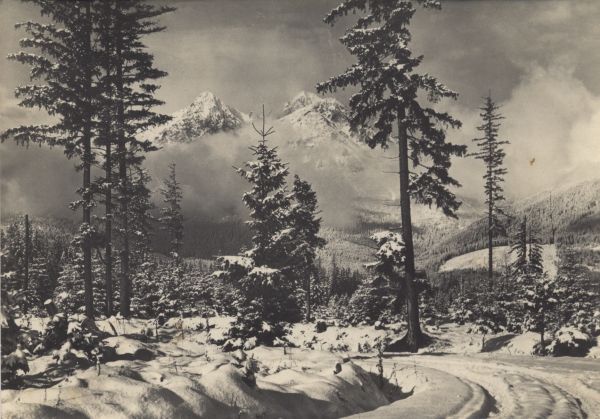 Widok na Łomnicę i Kieżmarski Szczyt z Matlar w scenerii zimowej. Na pierwszym planie droga i pojedyncze drzewa, w głębi las.