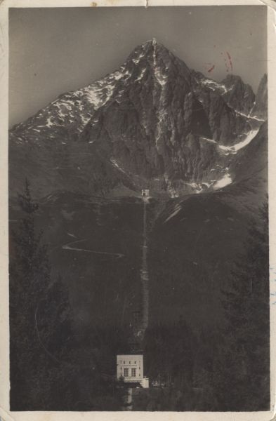 Widok na Łomnicę i trasę kolei linowej na szczyt. Na pierwszym planie stacja początkowa w Tatrzańskiej Łomnicy, wyżej stacja pośrednia nad Łomnickim Stawem.
