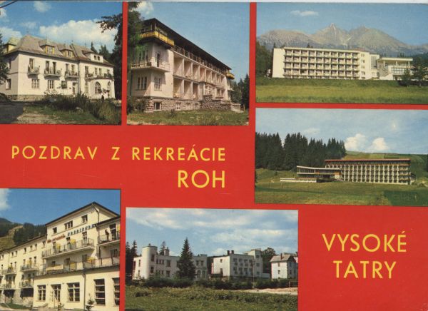 [?]. Pomiędzy zdjęciami napis: POZDRAV Z REKREÁCIE ROH. Na dole napis: VYSOKÉ TATRY. VYSOKÉ TATRY.