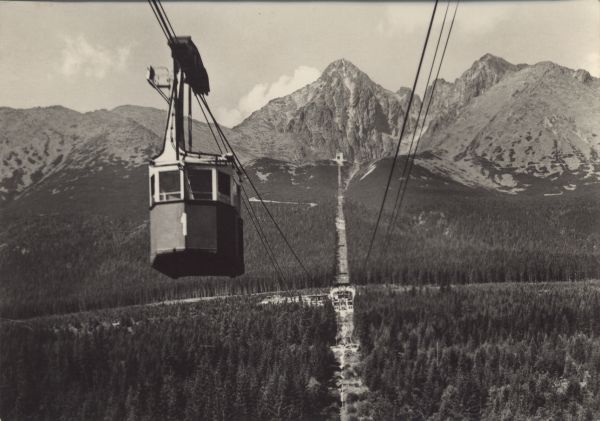 Tatry Wysokie - kolej linowa na Łomnicę pod ni± kotlina Łomnickiego Stawu. [Błędny opis, wagonik kolei linowej znajduje się nad Wielkim Lasem na południe od Tatrzańskiej Łomnicy]