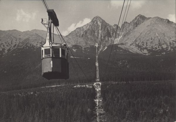 Tatry Wysokie - kolej linowa na Łomnicę pod nią kotlina Łomnickiego Stawu. [Błędny opis, wagonik kolei linowej znajduje się nad Wielkim Lasem na południe od Tatrzańskiej Łomnicy]