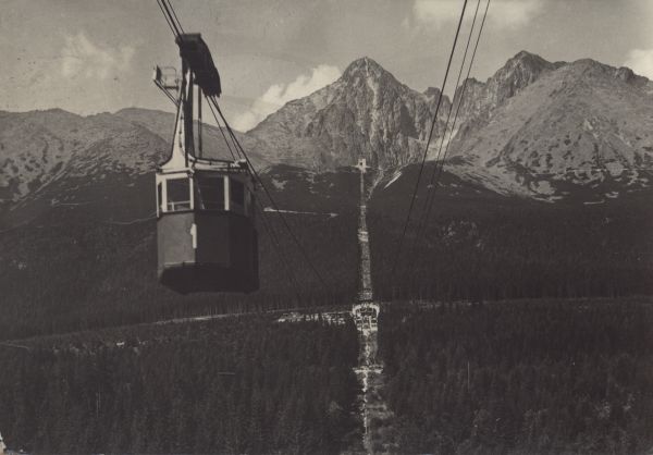 Tatry Wysokie - kolej linowa na Łomnicę pod nią kotlina Łomnickiego Stawu. [Błędny opis, wagonik kolei linowej znajduje się nad Wielkim Lasem na południe od Tatrzańskiej Łomnicy]