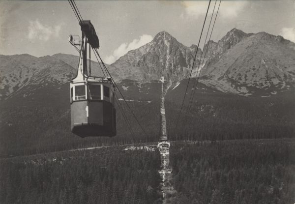 Tatry Wysokie - kolej linowa na Łomnicę pod ni± kotlina Łomnickiego Stawu. [Błędny opis, wagonik kolei linowej znajduje się nad Wielkim Lasem na południe od Tatrzańskiej Łomnicy]