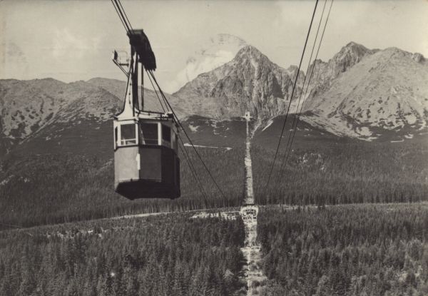 Tatry Wysokie - kolej linowa na Łomnicę pod nią kotlina Łomnickiego Stawu. [Błędny opis, wagonik kolei linowej znajduje się nad Wielkim Lasem na południe od Tatrzańskiej Łomnicy]