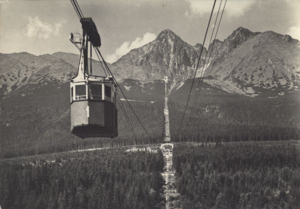 Wagonik kolei linowej na Łomnicê na trasie do Łomnickiego Stawu nad Wielkim Lasem. Widoczna stacja po¶rednia - Start. W tle Łomnica i Kieżmarski Szczyt.