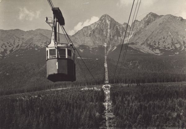 Tatry Wysokie - kolej linowa na Łomnicę pod ni± kotlina Łomnickiego Stawu. [Błędny opis, wagonik kolei linowej znajduje się nad Wielkim Lasem na południe od Tatrzańskiej Łomnicy]