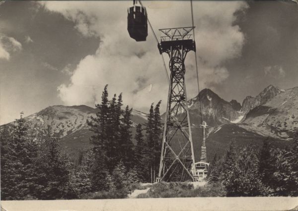 Wagonik kolei linowej na Łomnicę na trasie do Łomnickiego Stawu przy podporze. W dole widoczna stacja po¶rednia - Start toczona lasem. Wyżej stacja nad Łomnickim Stawem. W tle Łomnica, Zachodni Szczyt Wideł, Przełęcz w Widłach, Wielki Szczyt Wideł i Kieżmarski Szczyt.