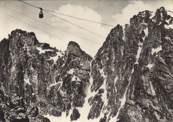 Wagonik kolei linowej na Łomnicê w drodze na szczyt. W tle Wielki Szczyt Wideł, Wschodni Szczyt Wideł i Kieżmarski Szczyt.