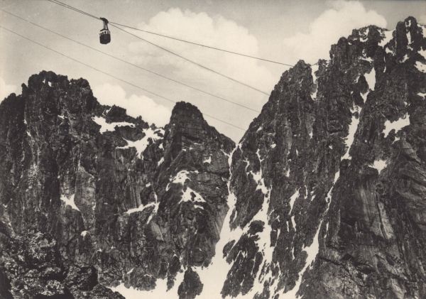 Wagonik kolei linowej na Łomnicê w drodze na szczyt. W tle Wielki Szczyt Wideł, Wschodni Szczyt Wideł i Kieżmarski Szczyt.