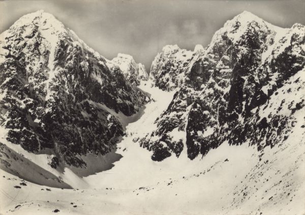 Widok na Łomnicę, Zachodni Szczyt Wideł, Przełęcz w Widłach, Wielki Szczyt Wideł, Wschodni Szczyt Wideł, Kieżmarsk± Przełęcz i Kieżmarski Szczyt w scenerii zimowej.