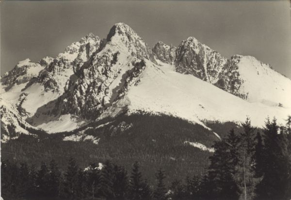 Tatry Wysokie. Widok ze zbocza Sławkowskiego Szczytu. W lewo Baranie Rogi, Durny Szczyt. Na wprost Łomnica i Kieżmarski Szczyt.