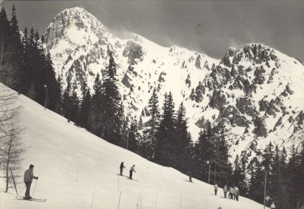 Widok ze stoku narciarskiego nad Siodełkiem na Łomnicê i Łomnick± Gran. Na pierwszym planie narciarze na stoku.