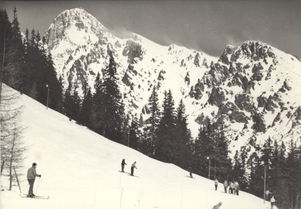 Widok ze stoku narciarskiego nad Siodełkiem na Łomnicê i Łomnick± Grań. Na pierwszym planie narciarze na stoku.