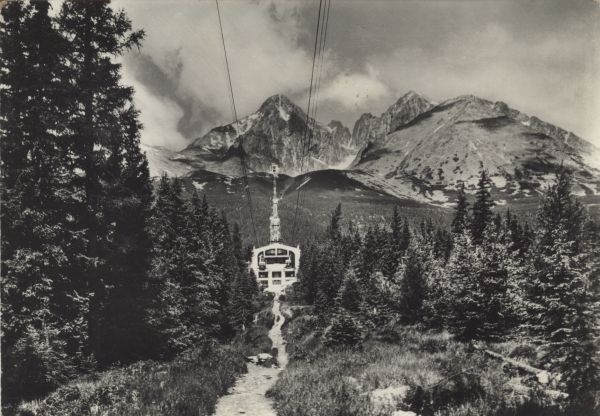 Kolei linowa na Łomnicę na trasie do Łomnickiego Stawu. Na pierwszym planie drzewa i stacja po¶rednia - Start, przed któr± widać 2 wagoniki kolei. Wyżej stacja nad Łomnickim Stawem. W tle Łomnica, Zachodni Szczyt Wideł, Przełęcz w Widłach, Wielki Szczyt Wideł, Kieżmarski Szczyt i Huncowski Szczyt.