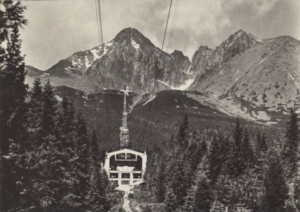 Kolei linowa na Łomnicę na trasie do Łomnickiego Stawu. Na pierwszym planie stacja po¶rednia - Start otoczona lasem. Wyżej stacja nad Łomnickim Stawem. W tle Łomnica, Zachodni Szczyt Wideł, Przełęcz w Widłach, Wielki Szczyt Wideł i Kieżmarski Szczyt.