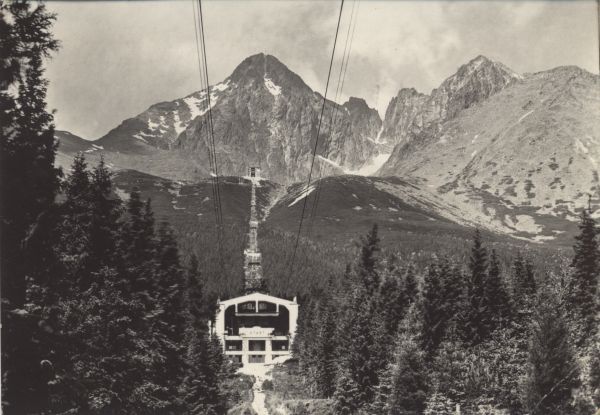 Kolei linowa na Łomnicę na trasie do Łomnickiego Stawu. Na pierwszym planie stacja po¶rednia - Start otoczona lasem. Wyżej stacja nad Łomnickim Stawem. W tle Łomnica, Zachodni Szczyt Wideł, Przełęcz w Widłach, Wielki Szczyt Wideł i Kieżmarski Szczyt.