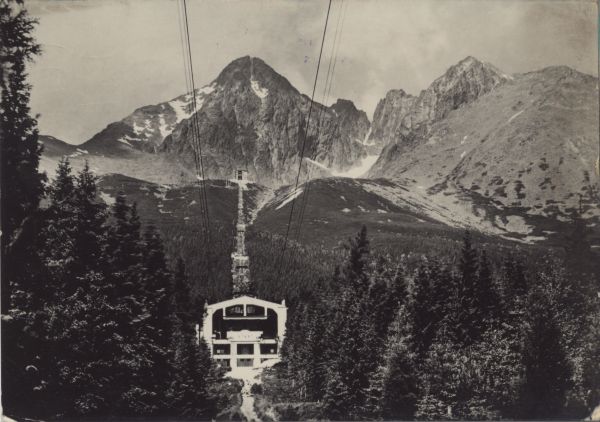 Kolei linowa na Łomnicę na trasie do Łomnickiego Stawu. Na pierwszym planie stacja po¶rednia - Start otoczona lasem. Wyżej stacja nad Łomnickim Stawem. W tle Łomnica, Zachodni Szczyt Wideł, Przełęcz w Widłach, Wielki Szczyt Wideł i Kieżmarski Szczyt.