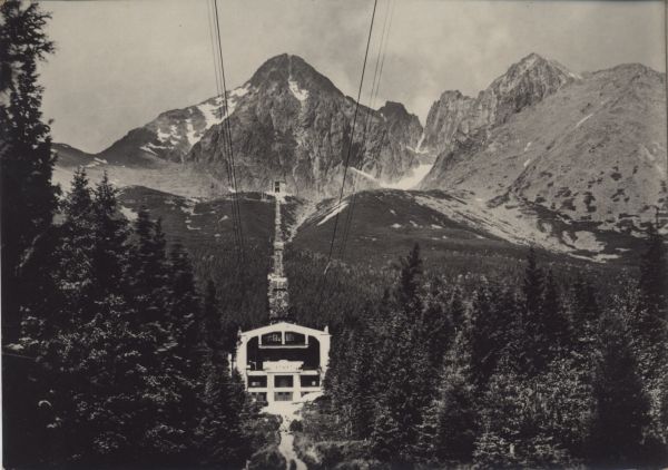 Kolei linowa na Łomnicę na trasie do Łomnickiego Stawu. Na pierwszym planie stacja po¶rednia - Start otoczona lasem. Wyżej stacja nad Łomnickim Stawem. W tle Łomnica, Zachodni Szczyt Wideł, Przełęcz w Widłach, Wielki Szczyt Wideł i Kieżmarski Szczyt.