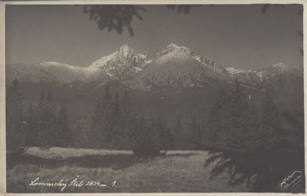 Widok z Tatrzańskiej Łomnicy. Na pierwszym planie polana, w głębi las. W tle: Sławkowski Szczyt, Łomnica, Widły, Kieżmarski Szczyt, Huncowski Szczyt i Rakuska Czuba. Na dole po lewej stronie wpisany tytuł, po prawej fotograf (nieczytelne).