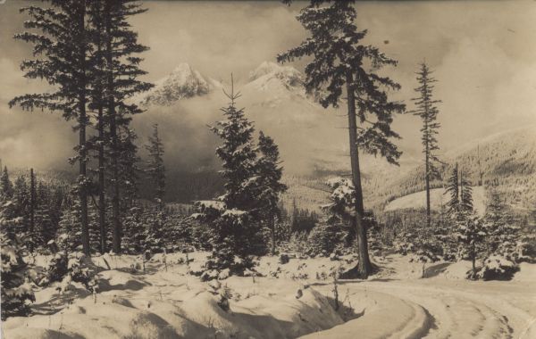 Widok na Łomnicę i Kieżmarski Szczyt z Matlar w scenerii zimowej. Na pierwszym planie droga i pojedyncze drzewa, w głębi las.