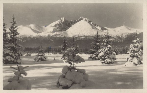 Zimowy widok na Łomnicę, Zachodni Szczyt Wideł, Przełęcz w Widłach, Wielki Szczyt Wideł, Kieżmarski Szczyt i Dolinę Łomnicką z Tatrzańskiej Łomnicy. Na pierwszym planie ośnieżone świerki (Picea A. Dietr.), w głębi las.
