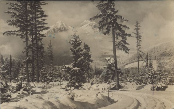 Widok na Łomnicę i Kieżmarski Szczyt z Matlar w scenerii zimowej. Na pierwszym planie droga i pojedyncze drzewa, w głębi las.