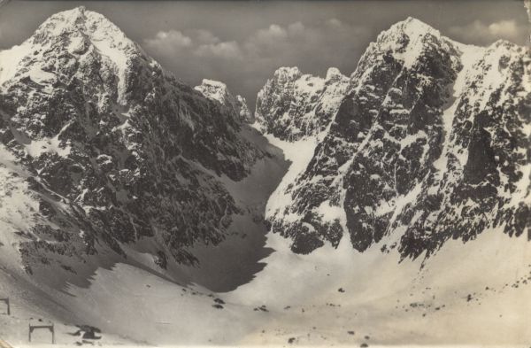 Widok na Łomnicę, Zachodni Szczyt Wideł, Przełęcz w Widłach, Wielki Szczyt Wideł, Wschodni Szczyt Wideł, Kieżmarsk± Przełęcz, Kieżmarski Szczyt i Kieżmarsk± Czubę w scenerii zimowej.