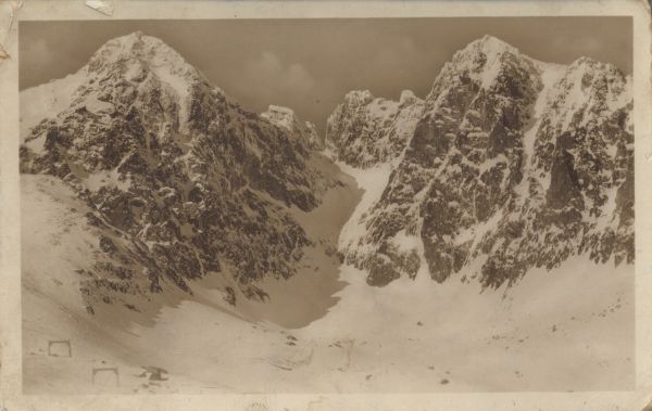 Widok na Łomnicę, Zachodni Szczyt Wideł, Przełęcz w Widłach, Wielki Szczyt Wideł, Wschodni Szczyt Wideł, Kieżmarsk± Przełęcz, Kieżmarski Szczyt i Kieżmarsk± Czubę w scenerii zimowej.