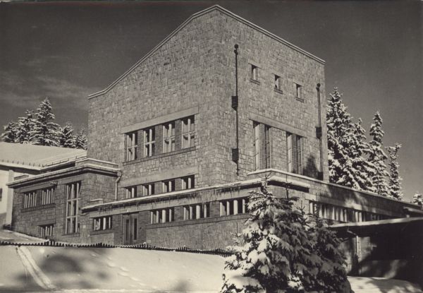 Widok na budynek stacji kolei linowej na Łomnicę w Tatrzańskiej Łomnicy i jej otoczenie zim±. Na pierwszym planie o¶nieżone ¶wierki (Picea A. Dietr.).