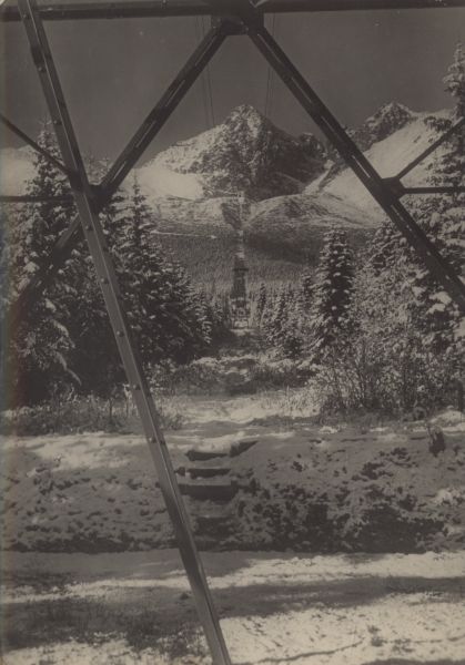 Kolei linowa na Łomnicę na trasie do Łomnickiego Stawu w scenerii zimowej. Na pierwszym planie przęsła podpory. W głębi stacja pośrednia - Start otoczona lasem, wyżej stacja nad Łomnickim Stawem. W tle Łomnica, Widły i Kieżmarski Szczyt.