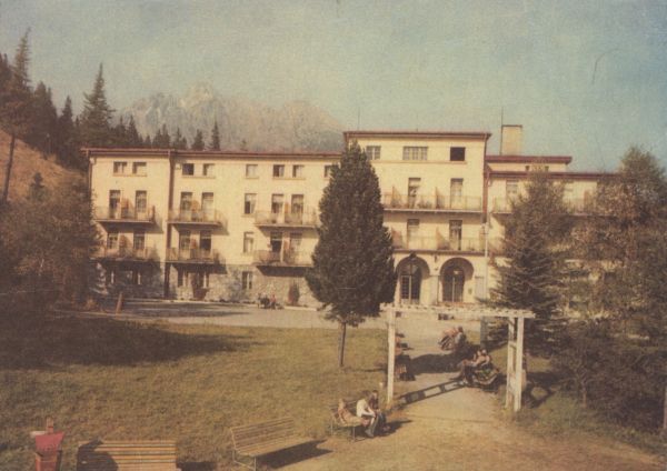Tatrzański Park Narodowy [Słowacja]. Siodełko. Dom wypoczynkowy RZZ Hrebienok. Z tyłu Łomnica. Tytuł również w języku: ros., niem., ang.