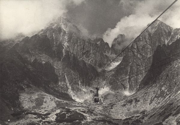 Tatrzański Park Narodowy [Słowacja]. Kolej linowa na Łomnicę, w prawo: Zachodni Szczyt Wideł, Przełęcz w Widłach, Wielki Szczyt Wideł i Kieżmarski Szczyt.