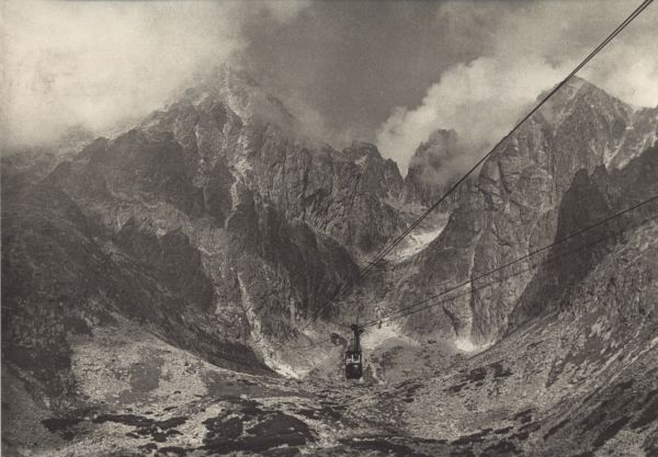 Tatrzański Park Narodowy [Słowacja]. Kolej linowa na Łomnicę, w prawo: Zachodni Szczyt Wideł, Przełęcz w Widłach, Wielki Szczyt Wideł i Kieżmarski Szczyt.