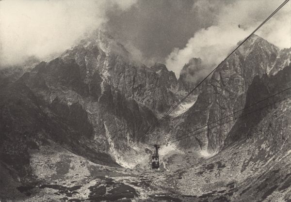 Tatrzański Park Narodowy [Słowacja]. Kolej linowa na Łomnicę, w prawo: Zachodni Szczyt Wideł, Przełęcz w Widłach, Wielki Szczyt Wideł i Kieżmarski Szczyt.