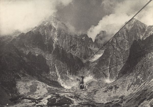 Tatrzański Park Narodowy [Słowacja]. Kolej linowa na Łomnicę, w prawo: Zachodni Szczyt Wideł, Przełęcz w Widłach, Wielki Szczyt Wideł i Kieżmarski Szczyt.