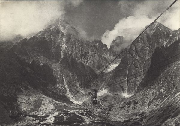 Wagonik kolei linowej nad Dolin± Łomnick±. W dole płaty kosodrzewiny (Pinus mugo Turra). W tle Łomnica, Zachodni Szczyt Wideł, Przełęcz w Widłach, Wielki Szczyt Wideł i Kieżmarski Szczyt.