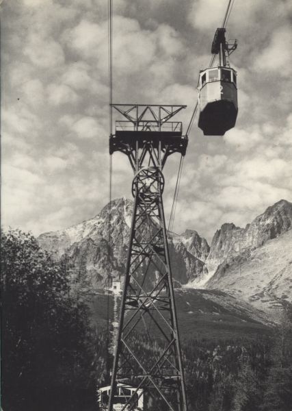 TATRANSKĘ NÁRODNĘ PARK Lanovka na Skalnaté pleso (1761 m), dolu medzistanica ©tart (1145 m), v pozadí Lomnickę čtít (2632 m)