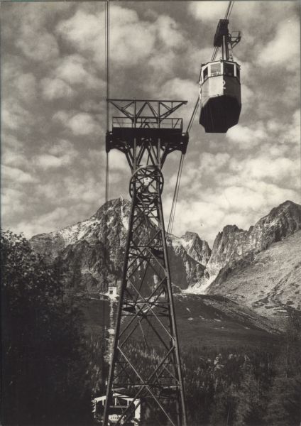 VYSOKÉ TATRY - lanovka na Skalnaté pleso (1761 m), dole medzistanica Štart (1145 m), v pozadí Lomnický štít (2632 m)