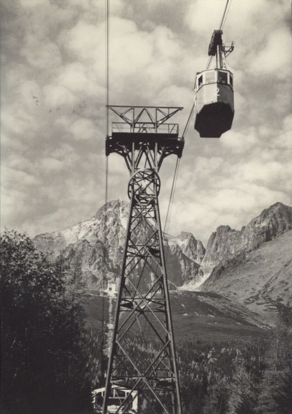 TATRANSKĘ NÁRODNĘ PARK Lanovka na Skalnaté pleso (1761 m), dolu medzistanica ©tart (1145 m), v pozadí Lomnickę čtít (2632 m)