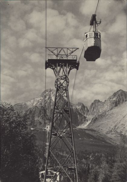 VYSOKÉ TATRY Lanovka na Skalnaté pleso (1761 m), dolu medzistanica Štart (1145 m), v pozadí Lomnický štít (2632 m)