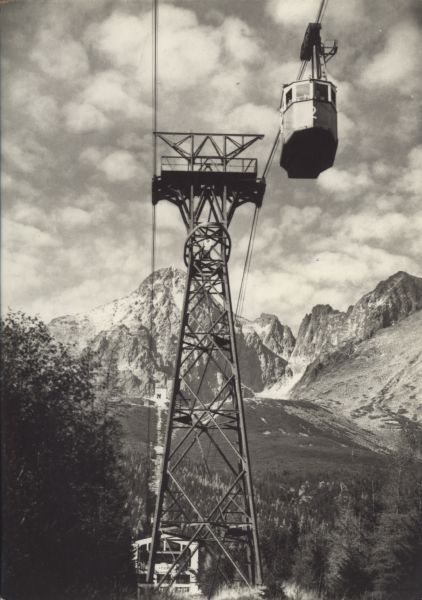 Tatry Wysokie - Kolej linowa nad Łomnicki Staw, w dole stacja pośrednia Start w tle Łomnica. Tytuł również w języku: ros., niem., ang.