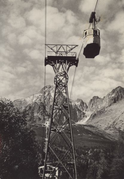 Tatry Wysokie - Kolej linowa nad Łomnicki Staw, w dole stacja pośrednia Start w tle Łomnica. Tytuł również w języku: ros., niem., ang.