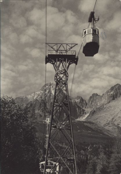VYSOKÉ TATRY Lanovka na Skalnaté pleso (1761 m), dolu medzistanica Štart (1145 m), v pozadí Lomnický štít (2632 m)