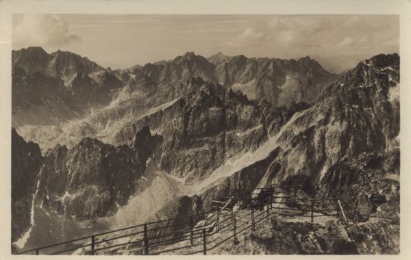 Widok ze szczytu Łomnicy na zachód. Na pierwszym planie taras widokowy na wierzchołku.