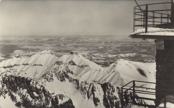 Panorama Tatr Bielskich z wierzchołka Łomnicy w scenerii zimowej. Na pierwszym planie po prawej stronie fragment budynku stacji kolei linowej.