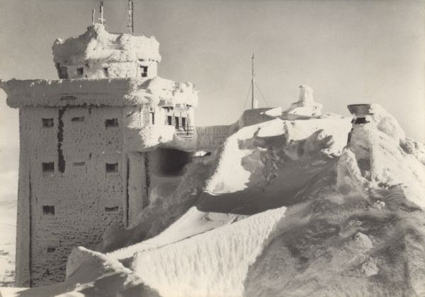 Widok na za¶nieżony budynek stacji kolei linowej na wierzchołku Łomnicy.
