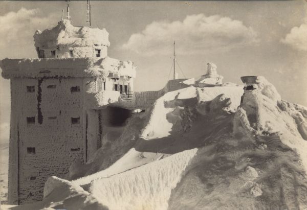 Widok na zaśnieżony budynek stacji kolei linowej na wierzchołku Łomnicy.